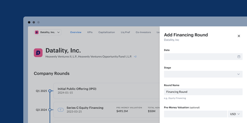 Create and manage rounds and exits independent of legal documents. Track comprehensive deal information including transaction dates, counter parties, structure details, and notes all within a unified interface.